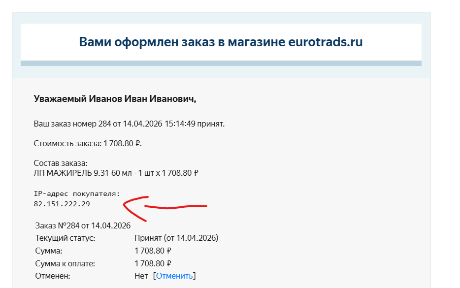 Теперь в админке сайта в информации о заказе появится IP адрес покупателя
