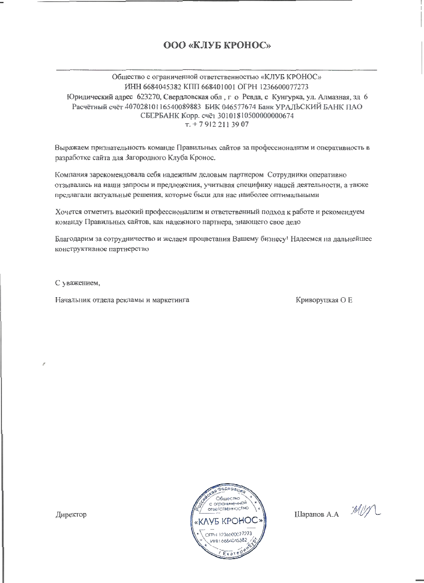 Выражаем признательность команде Правильных сайтов за профессионализм и оперативность в разработке сайта для Загородного Клуба Кронос.