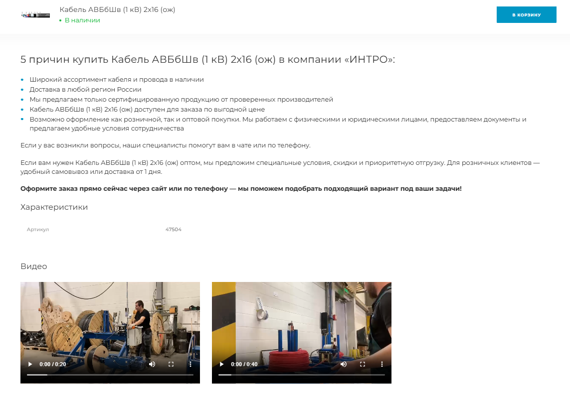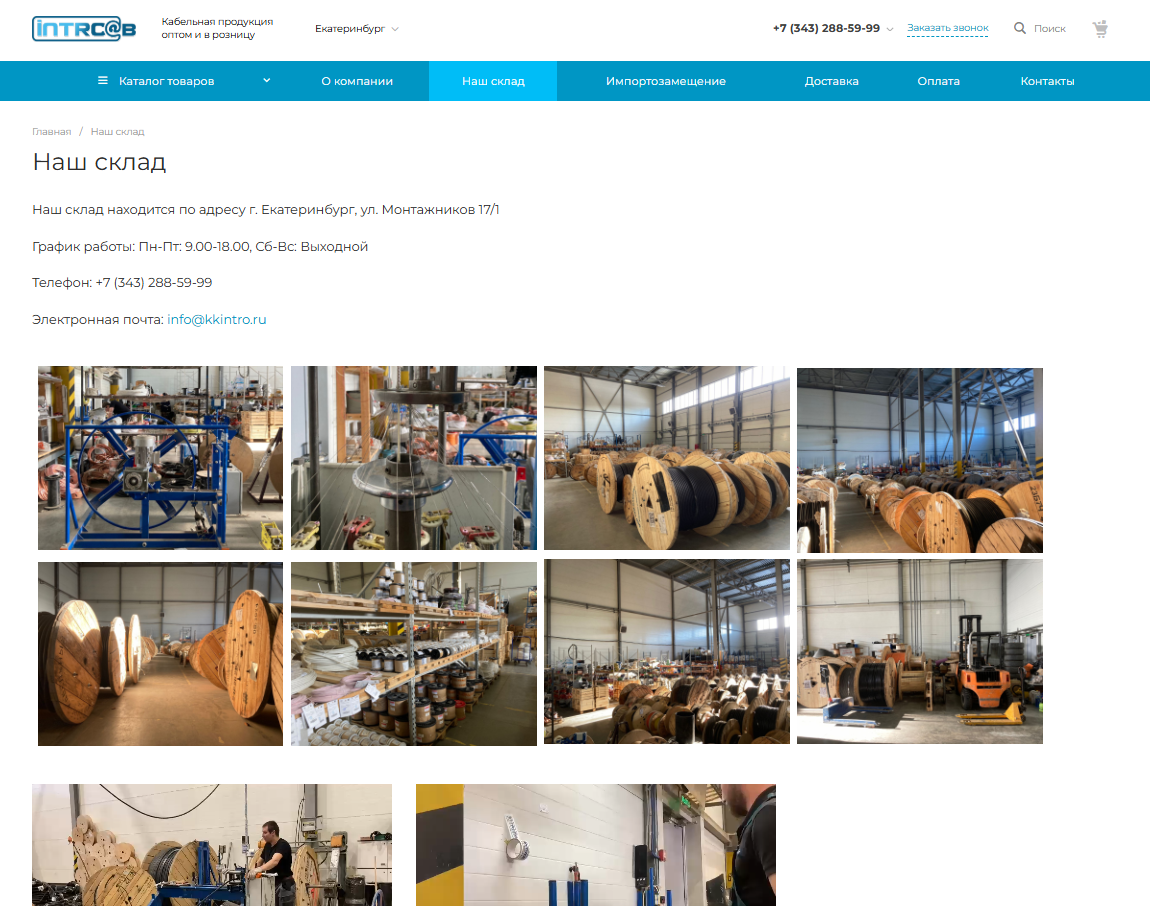 Компания "Интро" — одна из ведущих компаний на российском рынке кабельно-проводниковой продукции с более чем 15-летним опытом работы. В её ассортименте представлены силовые кабели, контрольные кабели, кабели для управления, монтажные провода и специализированные виды продукции, включая высоковольтные и бронированные кабели. Компания обеспечивает широкий складской ассортимент с более чем 2500 маркоразмерами, что позволяет оперативно удовлетворять потребности как крупных промышленных предприятий, так и прочих клиентов.